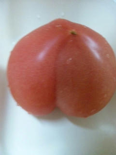 この間買ったトマト。良く見たらしんちゃんのおしりに似てます。
